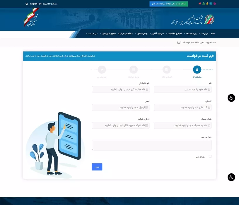 سامانه سفارشی نوبت دهی ملاقات به درخواست شرکت ساخت و توسعه زیربناهای حمل و نقل کشور توسط شرکت طراحی وب سایت و سامانه های سفارشی ایزی وب طراحی و پیاده سازی شد. با استفاده از این سامانه کاربران پس از ورود اطلاعات هویتی خود میتوانند درخواست ملاقات خود را با واحد مد نظر خود پس از دریافت نوبت مراجعه ثبت کنند و در انتها کد پیگیری دریافت کنند. سپس امکان بررسی وضعیت درخواست خود را با استفاده از کد پیگیری خواهند داشت و در صورت تایید درخواست ملاقات میتوانند در زمانی که در سامانه انتخاب کرده اند به دفتر مربوطه مراجعه کنند.